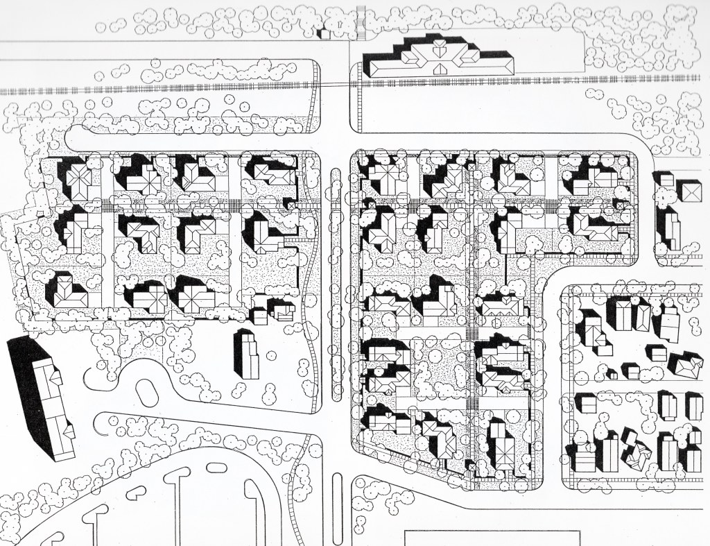 This flat, public site is located on the Lake Michigan shore. It serves as an east-west transition zone between downtown, a train station/restaurant, and the beach; and a north-south zone between cottage and highrise condominum housing. The owner asked us to create for this and an adjacent site to the north, a phased masterplan for 29 houses within a private, gated planned unit development. Although obligated to satisfy this request, we attempted to subvert this antipublic program through various urban gestures. We eased the current scale change in housing by increasing the size of buildings south to north. We continued a local tradition of alleys by serving four or six houses with short dead-end streets for private auto access, thus keeping front doors on the public streets. Alleys and greenspaces preserve existing street corridors by extending right of ways. Within the site, a private walk joins the various sections of the development and the beach, but is located to provide visual connections between public spaces to the north, south, east and west.