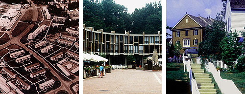 Pedestrian connectivity and convenience is the basis of New Urbanism, the latest version of the New Town movement. The quintessential New Urbanist diagram, reminiscent of drawings produced by Clarence Stein and Clarence Perry in the 1920’s, is a quarter mile radius circle representing a five-minute walk superimposed on an urban plan. Yet perhaps because New Urbanism claims not just towns but urbanism as its territory, it seems mysteriously unaware of previous New Town projects such as Greenbelt or Reston. Branded as cluster development with rail transit, New Urbanism is decidedly different from either the New Deal or Great Society towns, however, as illustrated by Kentlands, Maryland. In fact, Kentlands does not even have a rail connection to DC, so reaching it requires a 20-mile road trip from the Mall. Whereas the Greenbelt and Reston town centers are locations for a mixture of political, social, and commercial activity, the marketplace at Kentlands is a mono-functional collection of strip malls, big box retail and parking lots, remarkably similar to others in Montgomery County. It is the most ordinary and the least successful area of Kentlands, although it was repeatedly subjected to far more imaginative design schemes, indicating a gap between ideology and reality not present in Greenbelt and Reston. Although New Urbanism advocates pedestrian connectivity, the commercial center faces the primary state highway, not the surrounding apartment buildings and even more distant residential neighborhoods. Perhaps this gap in pedestrian access will be corrected as construction is completed on the streets of live/work townhouses connecting the commercial core to the neighborhoods. These streets aside there are not a townhousing neighborhood in Kentlands; townhouses and freestanding houses are intermixed, producing a schism between the usual relationship between building typology and urban density. While this schism is probably not noticeable to the average Kentlands resident or visitor, for the architecturally trained eye, it is disorientating and even disturbing. This street of live/work townhouses leads to the mansion and farm buildings of the former Kent family estate. Kentlands’ architectural character is derived from these buildings, which are now community facilities and the field office of the town’s architects, Duany Plater-Zyberk, the foremost proponents of New Urbanism. A pair of green lawns fan out from the Kent family mansion, serving as parks for the surrounding neighborhood, which is the most intimate and quirky of Kentlands’ six residential districts. Three lakes and a stream, also original to the farm, loosely separate these six neighborhoods. Unlike Greenbelt or Reston, these greenbelts are not ambiguously defined nor do they constitute the primary public space; squares and parks form the public domain in Kentlands. One of the most successful squares in Kentlands is a semi-circular park containing the neighborhood recreation center. The boundaries of the park are framed by a continuous wall of four-story townhouses, reminiscent of the Royal Crescent in Bath. Figural, formal public spaces such as this are connected axially by streets, which are also re-affirmed and articulated as public space. When the grade becomes too steep for roads the visual continuity of the street grid is maintained by a series of steps and stairs, framed by private fences. Picket fences are ubiquitous at Kentlands; it is not the implied nostalgia of these fences that is significant, but the articulation of private property, which is made at even the smallest scales of design. Where fences do not exist, brick curbs clearly delimit the division between private garden and public sidewalk. Pedestrian and automotive non-resident traffic is located on the street, while garages are located predominately on alleys, which although “public” in a certain sense are the residents’ domain. However, unlike the automobile courts of Greenbelt or Reston, an exclusively private backyard, virtually invisible from the alley, exists between the garage and the house. The constant repetition of garage, townhouse roofscape and chimneys, as viewed from the alley, has a charming Mary Poppens-esque feel. On the street and in the alleys, as with the crescent-shaped recreation center park, public space of Kentlands is clearly defined and given form by private concerns. If the blurring of public and private spatiality of Greenbelt and Reston is reflective of the socialist era in which they were planned, then Kentlands and New Urbanism is reflective of Reaganism, known both for its nostalgic viewpoint and aggressive privatization of government services.