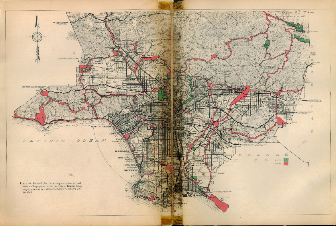 Mike Davis’ essay “How Eden Lost its Garden” probably introduced most casual historians of Los Angeles to the 1930 Parks, Playgrounds, and Beaches report authored by Olmsted Brothers and Bartholomew Associates. First published in the catalog for the 1994 Urban Revisions show at MoCA, then in Ed Soja and Allen Scott’s book The City, and finally as a chapter in his infamous Ecology of Fear (and yet again in Perspecta 30, Yale’s student journal), Davis’ essay retold the destruction of LA’s natural environment through the twentieth century. In this history, the 1930 Olmsted-Bartholomew report stood as the first official warning that LA’s explosive growth was occurring at the expense of public parkland, which had placed the city well short of the national park per capita ratio. Without a deliberate, systematic park program, LA’s lack of park space would inevitably become worse. Davis highlights in particular Olmsted and Bartholomew’s approach to the LA River, where they proposed to acquire large right-of-ways for a park corridor that would also double as a flood basin during the winter storms. However, in Davis’ version of history, the onset of the Depression and the sudden need to employ workers led the Federal government to instead encase the river in concrete. The result is a 52-mile long concrete channel that has more in common with LA’s freeways than with any other waterway in the world, and a nostalgia for the lost Eden of Olmsted and Bartholomew’s interconnected and interlaced parkways.