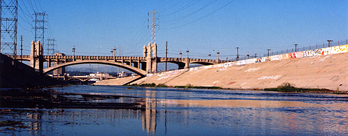A common perception of Angelenos is that the freeway is their only shared urban experience. This truism seems confirmed by an aerial view of greater Los Angeles, as the basin and valleys are criss-crossed by a series of linear, concrete paths. Surprisingly, these are not the freeways but the rivers, arroyos, and washes of the region’s flood control system. Although visually dominant from the air, the rivers are largely invisible and unseen to the everyday life of the city at the ground level, contained in concrete storm drains located in back alleys and behind industrial sites. Excluding the mountains and beaches, the water channels of the Los Angeles area – the Los Angeles and San Gabriel Rivers, the Arroyo Seco, the Tujunga and Verdugo Washes, Ballona and Dominguez Creeks, among others – are the central natural fact of the region.