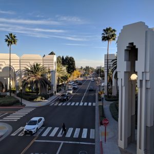 The smallest and most intimate oval opens towards downtown Beverly Hills and the famous Rodeo Drive. Nestled against City Hall, this plaza is centered by a grid of palm trees, small tiled planter and a gracious archway towards the City from which a now dry water channel runs to the sidewalk. It is the most conventional, and most successful, of the three plazas.