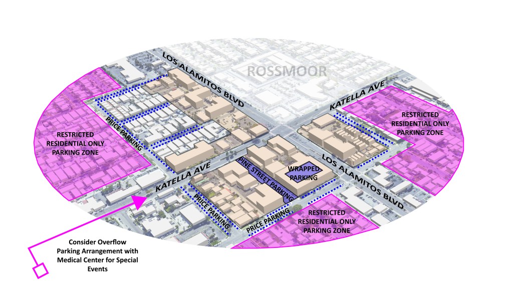 To encourage pedestrian connections from this Pine Street district to other sites in the Town Center area as well as the Medical Center and adjoining neighborhoods, the Plan proposes wide, tree-lined sidewalks on Los Alamitos Boulevard and Katella Avenue, as well as other adjacent streets. The Plan anticipates additional mixed-use development along these streets, and throughout the Town Center promotes new residential and housing options.