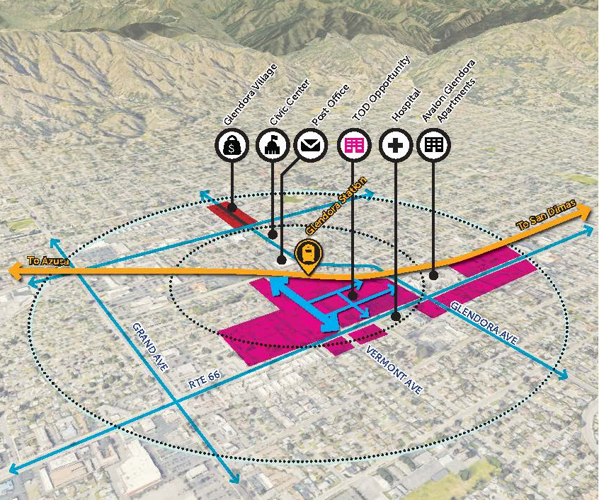 The City of Glendora created the Station Area Vision Plan to guide transit-oriented development around the future Metro A Line Station, opening in September 2025. The Plan identifies how to accommodate housing around the station and policies to implement the vision. The station area plan covers approximately a half mile radius around the future Glendora Station. The plan includes thoughtful development scenarios that provide a diverse mix of housing intensity and development types to accomplish the City’s housing element goals, while creating a dynamic transit-oriented neighborhood appropriate to the scale of community. PlaceWorks worked closely with the City and included a multifaceted outreach approach to ensure the Vision Plan aligns with community needs and values, including a public open house, online survey, and planning commission study sessions. The Vision Plan was adopted in July 2025.