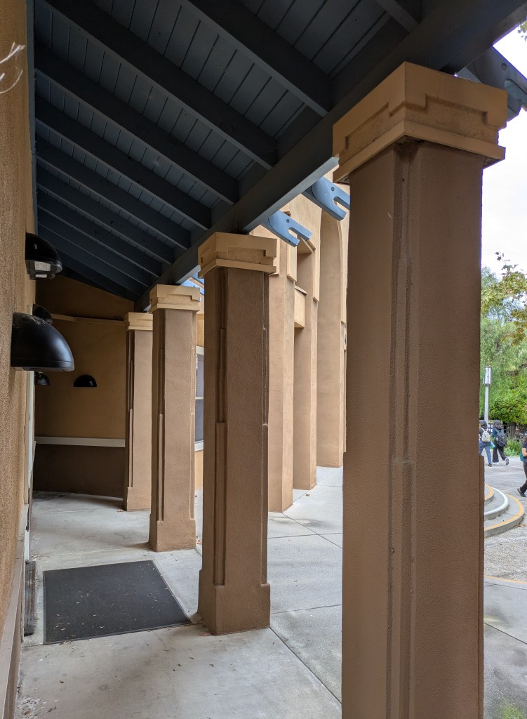 Behind the ochre-colored baroque facades are simple gable-roofed buildings containing offices and classrooms. Here the unity of the main facade(s) dissolves into a collection of loosely arranged structures around a loosely defined central courtyard flanked by shed-roof post-and-beam arcades. From this perspective, where the baroque facades read as clear false fronts, the architectural inspiration seems more cowboy western than Roman. As is often the case with Moore’s more experimental work, the quality of the architectural finishes and details is also a little cowboy western.