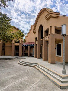 Charles Moore’s contribution to the UC Irvine campus, the domestically scaled Extension Education Center, is inspired by the three chapels of San Gregorio in Rome. In fact, as Moore himself admits in the essay “The Qualities of Quality,” the triparte elevation design featuring a scalloped baroque centerpiece flanked by paired arched facades, is a near literal copy of the 17th Century Roman precedent. Approached via a set of scalloped steps and sitework (more elaborate than in Rome), the building likely felt more monumental when first built than today now that it is surrounded by the multi-story boxes of the Business School, Law Library and nearby Social Sciences Parking Structure.