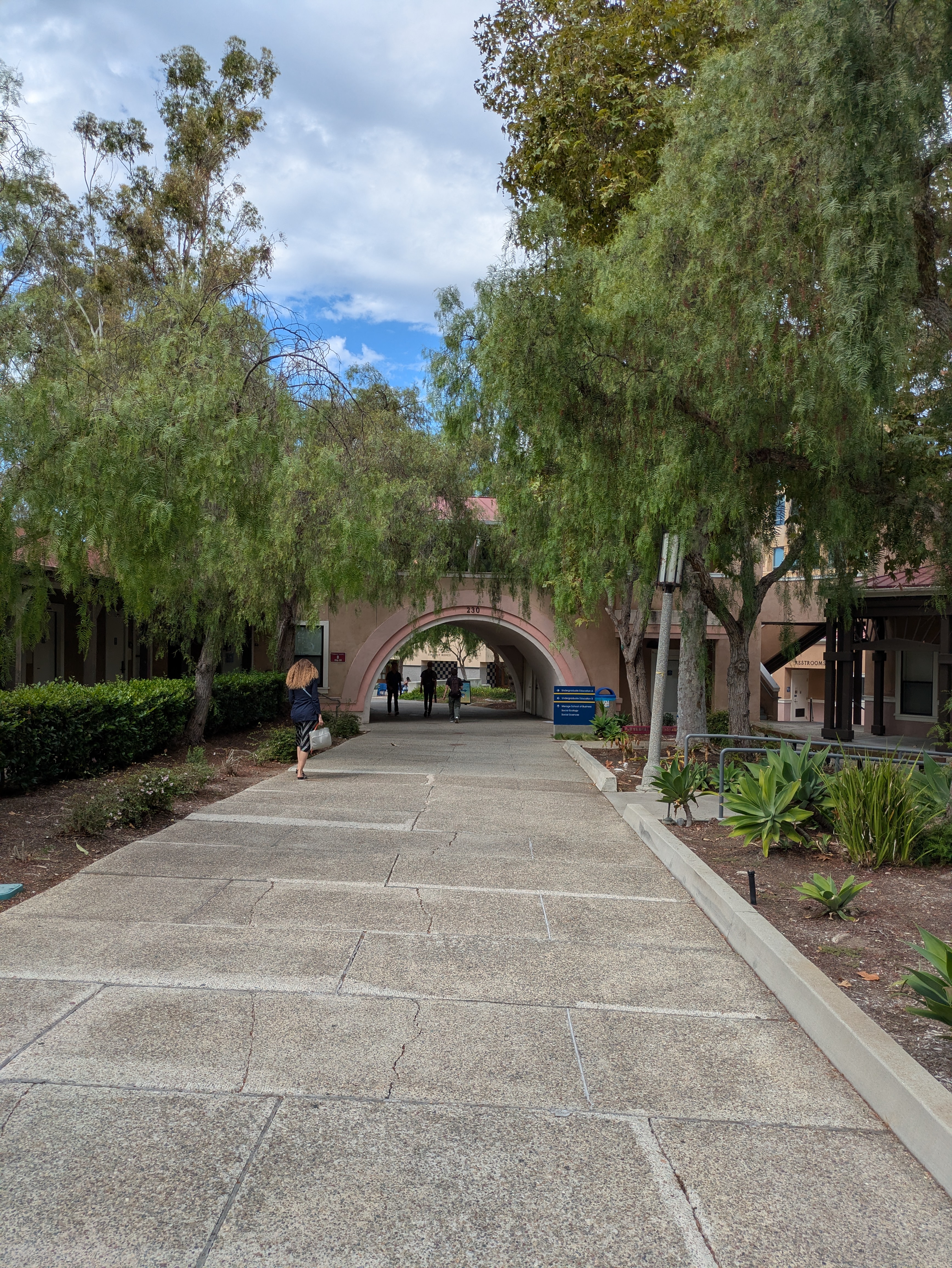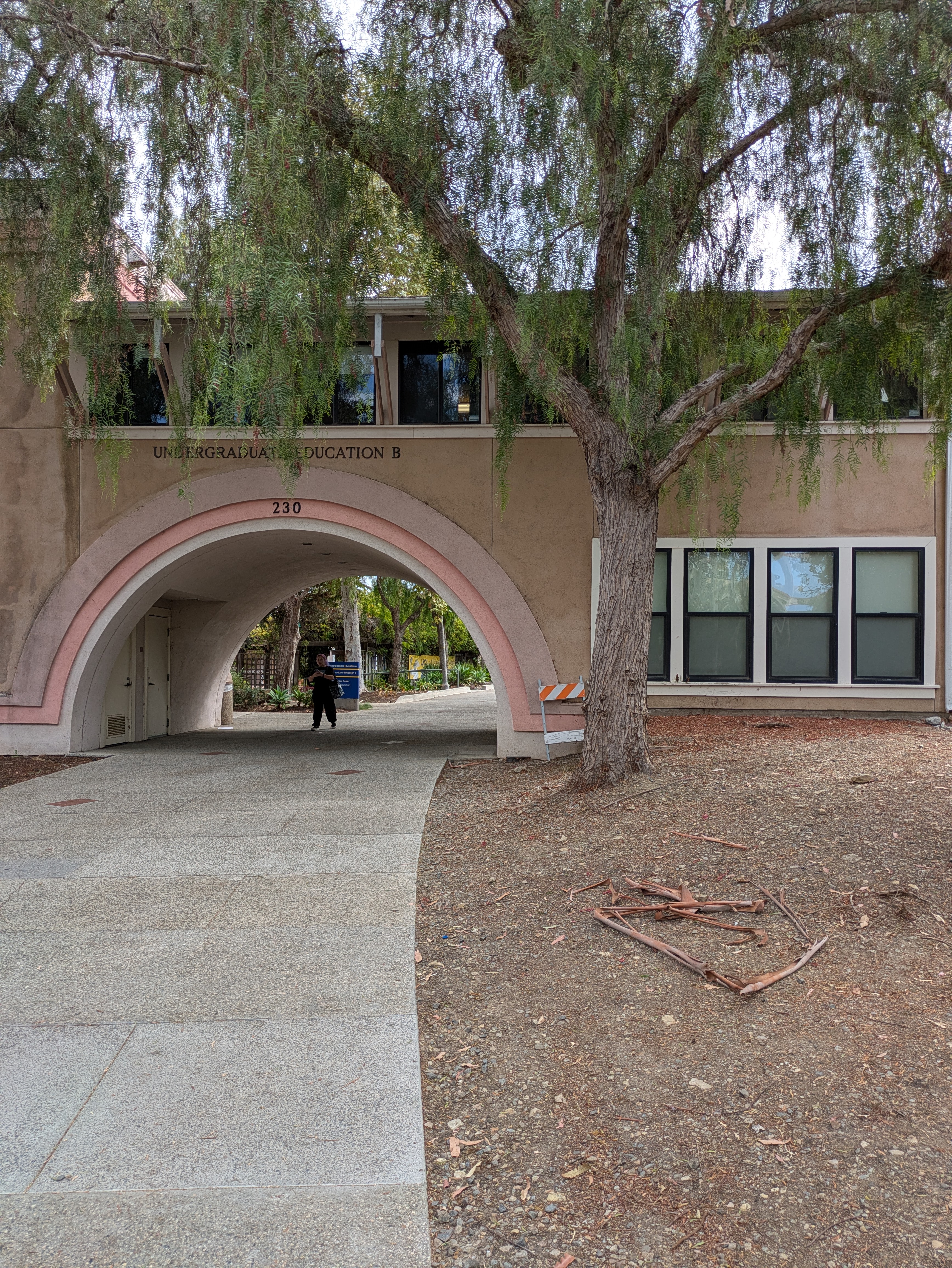 The baroque centerpiece is flanked by a pair of rambling buildings that create a piazza of sorts, delineating a promenade and pathway leading to/from the larger campus. Indeed, one of the structures bridges over the pathway with a low-slung postmodern archway, marking a gateway to this strange quasi-Roman fragment within the UCI campus. Like many of the forgotten corners of Rome, the legibility of this odd little California piazza is now obscured by overgrown landscaping and sycamore trees. One suspects Moore would be pleased.